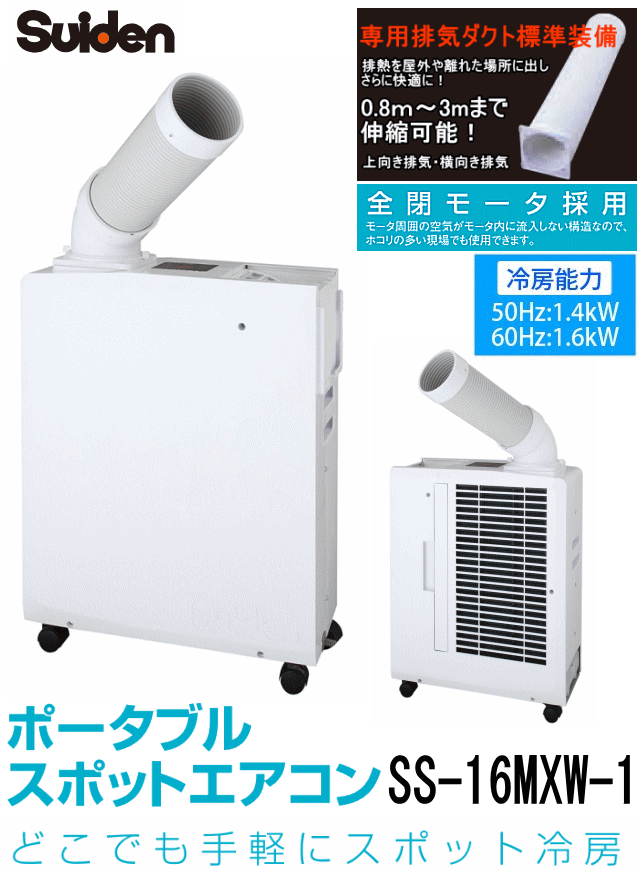 ) サイズ スイデン ポータブルスポットエアコン SS-16MXW-1 <専用排気ダクト標準付属> スイデン ポータブルスポットエアコン SS-16MXW-1 (専用排気ダクト標準付属) どこでも手軽にスポット冷房!小型なのに高機能! 省スペース3面壁際設置もOK。